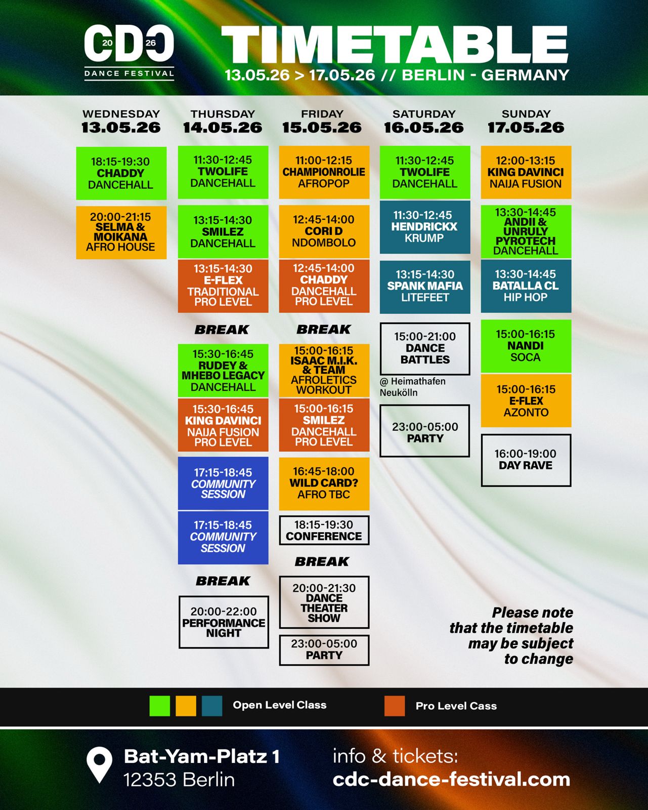 Vom 13. Mai bis zum 17. Mai 2026 findet in Neukölln, Berlin wieder das CDC Dance Festival statt. Das Festival begann in 2014 und hat sich mittlerweile zu dem zentralen Treffpunkt für Afrikanische und Karibische Street Style Kulturen in Europa etwickelt.